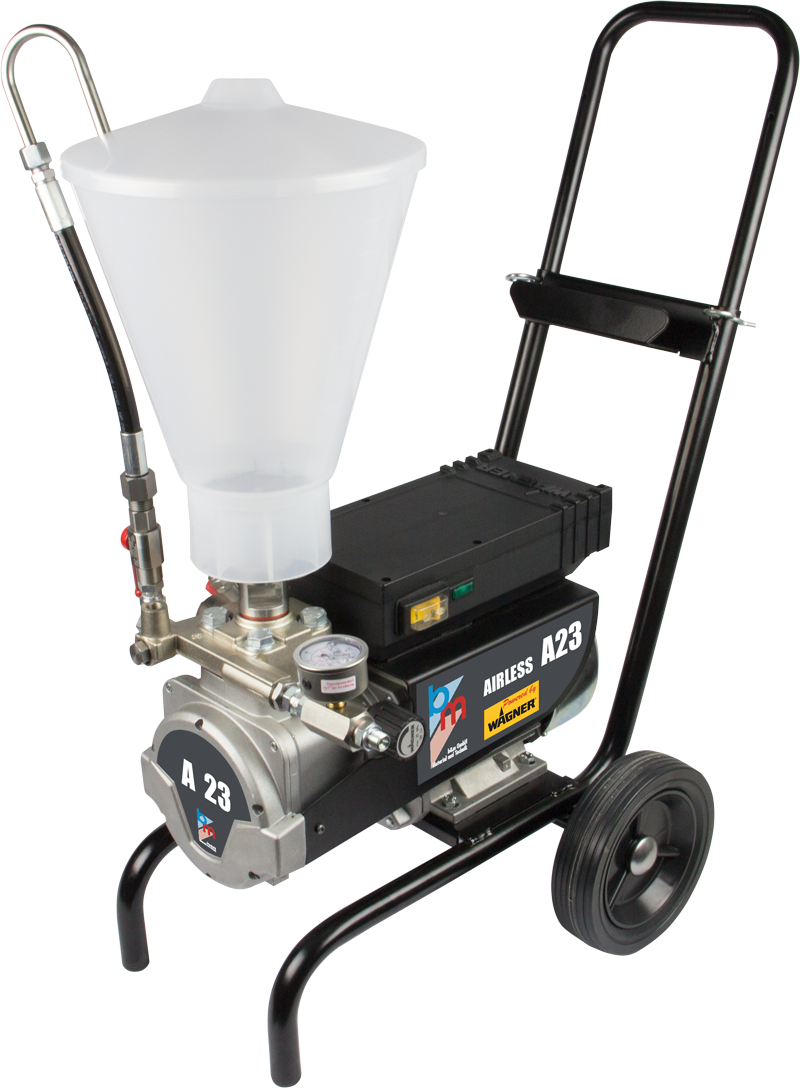 b & m A23 Electric diaphragm pump for use with i.a. paint, varnish and injection. TECHNICAL DATA: Motor: 230 V 50 Hz 1.3 kW Capacity: 2.6 liters / min. Working pressure: 0-250 bar Max. size of nozzle: 0.58 mm. NPS 1/4 " Max. liquid thickness: 20,000 mPas See brochure here. Watch the video here. p> | ![]() |