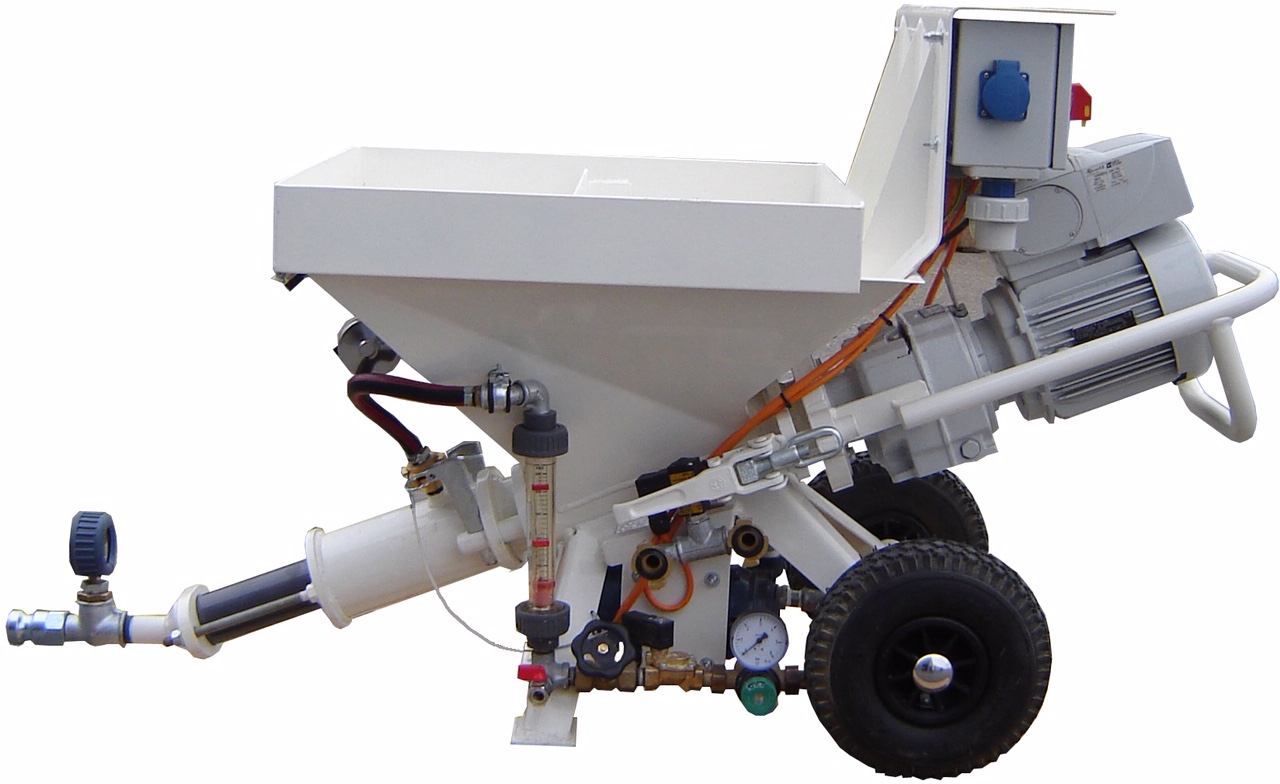 b & m Vertriebs-GmbH Electric pump with speed regulator. Universal mortar pump for - Cement-based mortars (dmax 3 mm) - Microcement - Decorative plaster - Putties - Leveling masses etc. TECHNICAL DATA: - MOTOR: 230 V 50 Hz 1.5 KW - Capacity: 0.2 -18 liters / min. - Max working pressure: 30 bar - Max hose length: 20 m (depending on material) - Nominal speed 106 - 403 rpm - Container 30/60 l - Weight approx. 70 kg - Length 120 cm - Board 55 cm - Height 70 cm Options: Remote control Nozzles for grouting Spray gun with various nozzles (requires air compressor 200 - 500 l / min) | ![]() ![]() ![]() ![]() |