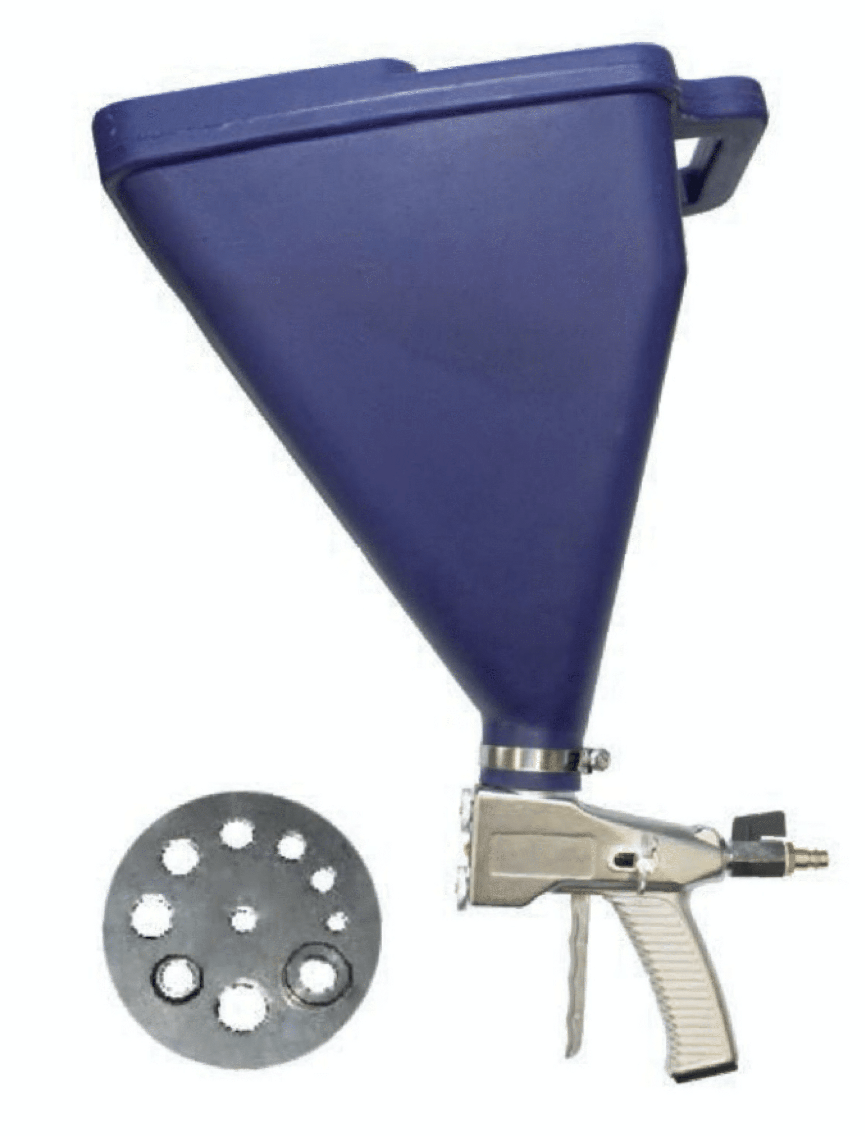 FUNNEL SYRINGE Handy and widely applicable plaster and mortar spray. Crafted in robust aluminum construction. 9-hole mouth plate with holes from 4-13 mm that are easy to adjust. Regulation of air and material supply. Capacity 6 l. Air consumption 220 l / min Recommended pressure 2-3 bar Max. grain size 6-8 mm Read brochure here | ![]() |